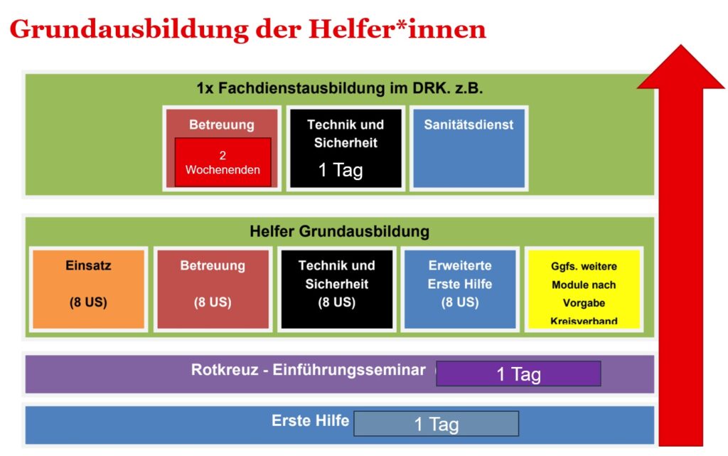 Darüber hinaus hast du jederzeit die Möglichkeit, dich weiterzuentwickeln: von spezialisierten Lehrgängen über den Rettungshelfer oder Rettungssanitäter bis hin zu Feldkoch oder Ausbilder. So bestimmst du selbst, wie weit dein Weg im DRK geht.
